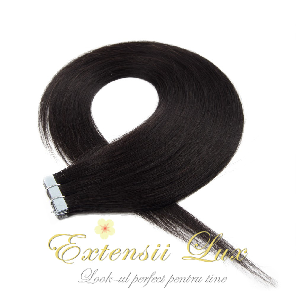 Extensiile Tape-In Negru Natural #1B se lipesc cu banda adeziva ( speciala pentru a nu va afecta integritatea firicelelor dvs) de parul dvs.